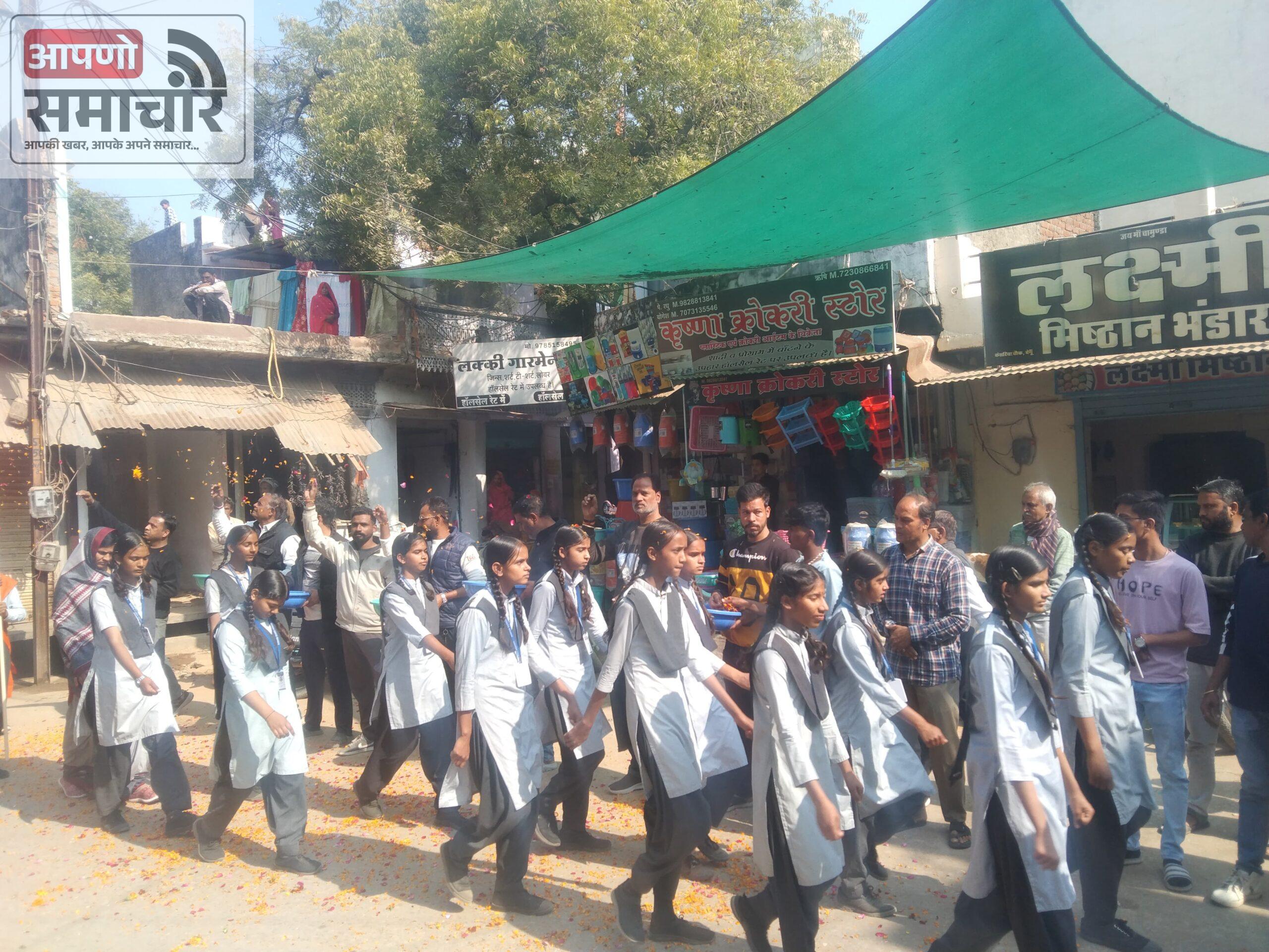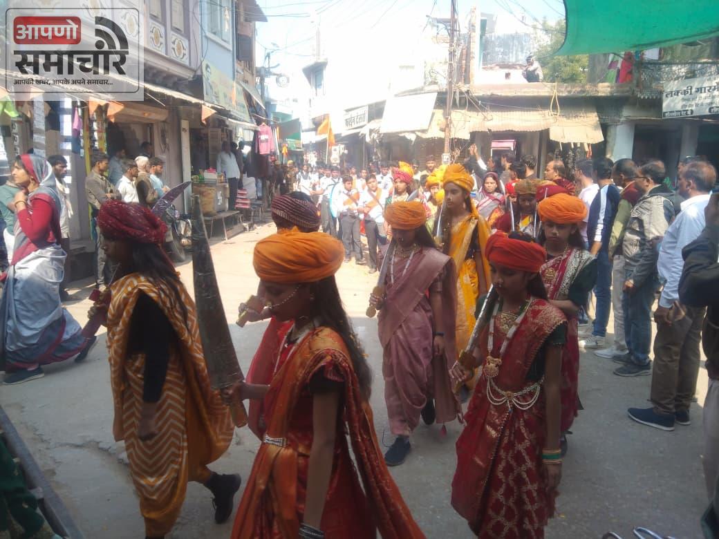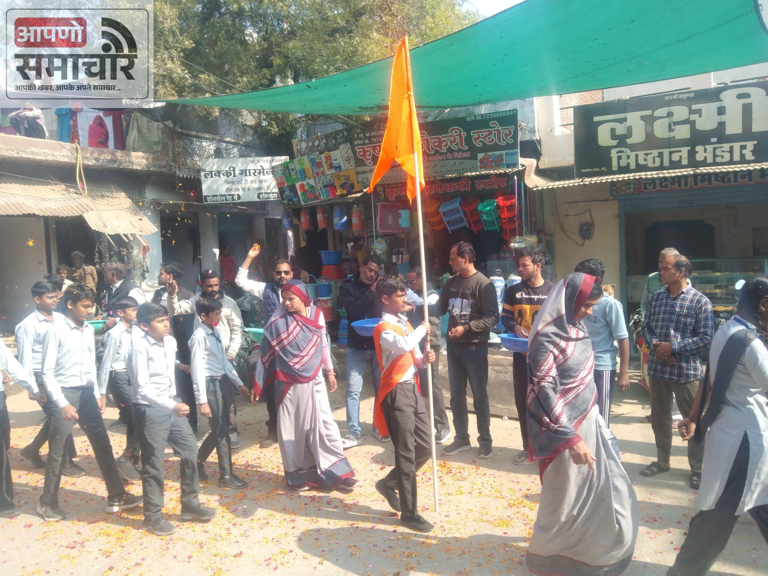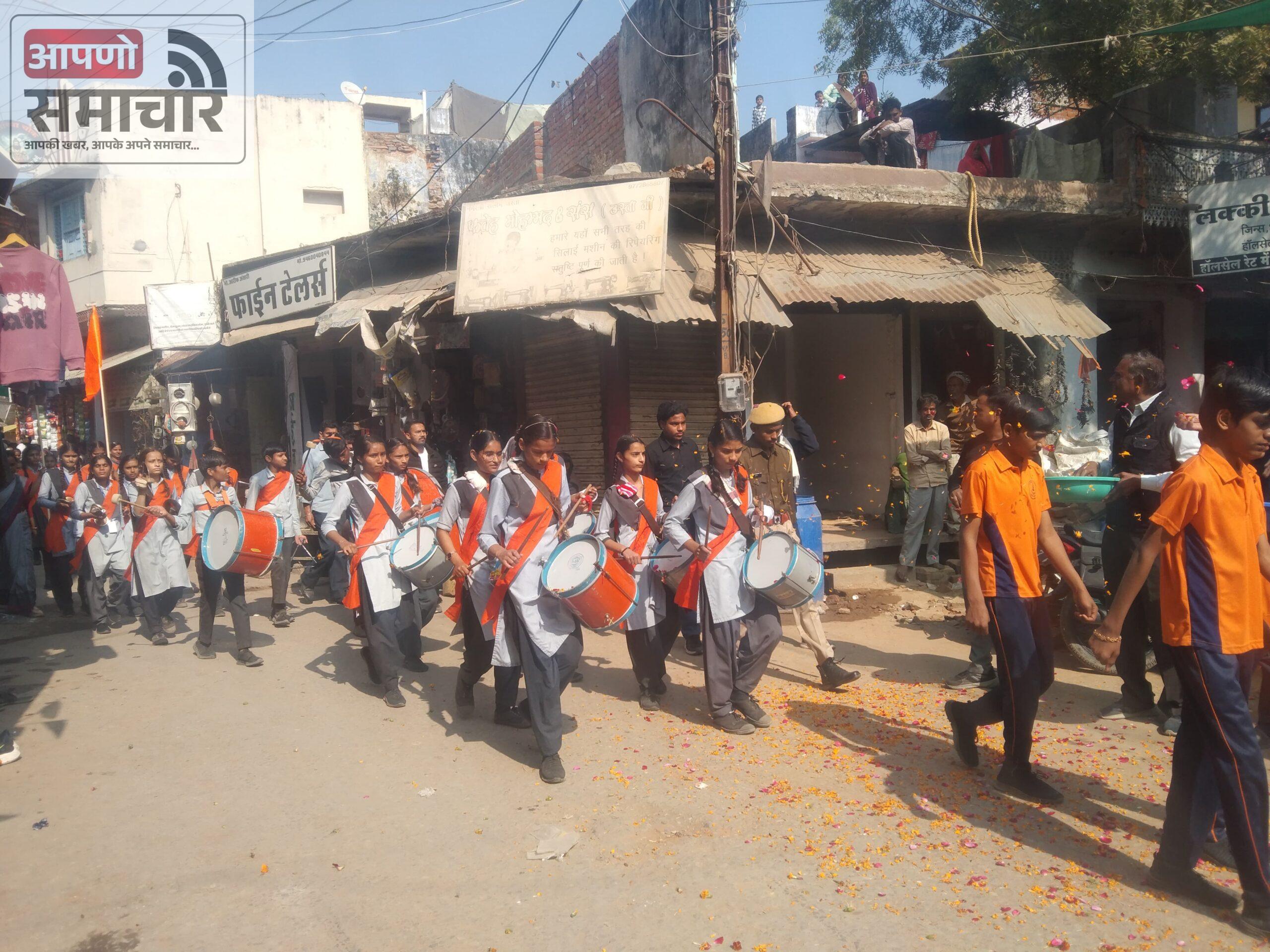 बेगूँ ( 12 जनवरी ) । बेगूँ में आदर्श विद्या मंदिर के विद्यार्थियों द्वारा 12 जनवरी,सोमवार को स्वामी विवेकानंद जयंती पर बेगूँ नगर में घोष की धुन पर पथ संचलन निकाला गया। इस संचलन में नारी सशक्तिकरण की झलक भी दिखायी दी। संचलन में बालिकाओं द्वारा वीर वीरांगनाओं की वेशभूषा पहन कर चल रही थी। जो आकर्षण का केन्द्र रही। पथ संचलन का नगर के पुराने बसस्टैंड, चेची रोड, लालबाई फूलबाई चौक व केसरिया चौक मे पुष्प वर्षा कर स्वागत किया गया। केसरिया चौक मे परशुराम मित्र मंडल द्वारा स्वागत किया गया। संचलन नगर के प्रमुख मार्ग व मौहल्लो से होकर निकला। जिसका सामाजिक एंव स्वयंसेवी संगठनों द्वारा पुष्पवर्षा कर स्वागत अभिनन्दन किया गया।